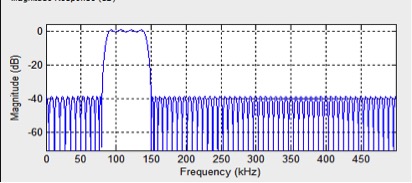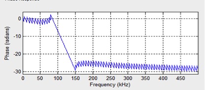 The design uses the MATLAB tool FDATool to create the FIR filter, as shown in Figure 3.3. The filtering process is effectively implemented. Based on the characteristics of the leakage acoustic emission signal and the parameters of the FIR filter [23], the initial design of the amplitude-frequency response is shown in Figure 3.4, and the phase delay diagram is presented in Figure 3.5. The main filter parameters are set as follows: (1) Bandpass response type; (2) Equal ripple design method; (3) Minimum filter order; (4) Density factor of 20; (5) Sampling frequency Fs = 1000 kHz, passband frequencies Fpass1=90kHz and Fpass2=140kHz, stopband frequencies Fstop1=80kHz and Fstop2=150kHz, passband ripple Apass=1dB, stopband attenuation Astop1=40dB, Astop2=40dB.