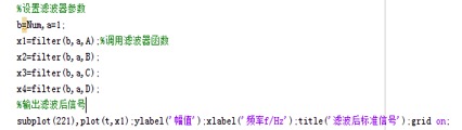 After designing the filter, the collected acoustic emission signal is filtered using the following steps: open the fdatool interface, select Export, set the output variable name to Num, then assign b=Num and a=1 in the editor, and finally apply the filter using x = filter(b, a, A). The specific code is shown in Figure 3.6. After filtering, the time-domain waveform of the acoustic emission signal is displayed in Figure 3.7.